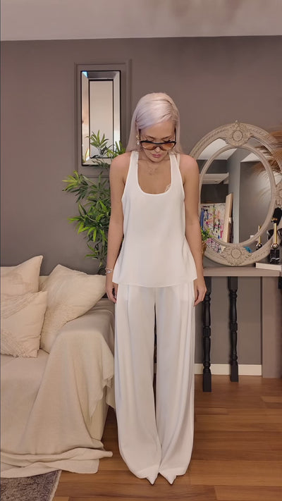 Loose-fitting, double-pleated palazzo trousers.