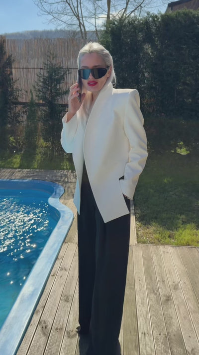 Krep kumaş ile tasarlanmış özel üretim vatkalı sayesinde keskin omuz hatlarına sahip yaka detaylı blazer ceket.