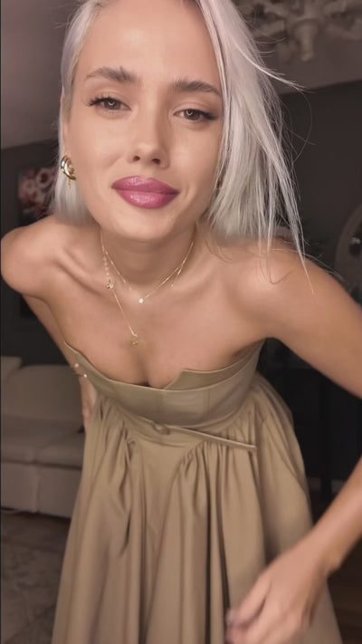 Hera uzun elbise, korse etkili üst bedeniyle vücudu kusursuzca sararken, pamuk içerikli kumaşı sayesinde gün boyu konfor sunar. Balen destekli yapısı formu vurgularken, cepli düz eteğiyle modern ve sade bir siluet sunar. Elbisenin kendi kumaşından yapılmış, çıkarılabilir kuşağı sayesinde bel hattını dilediğiniz gibi vurgulayabilirsiniz.