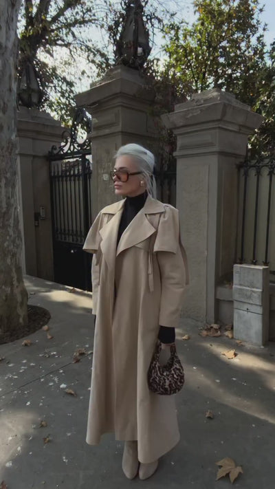 Oversize kalıbı ve omuzlarında bulunan pelerin detayları ile güçlü bir tasarım. biye detaylı kemer dahil mevsimlik trench