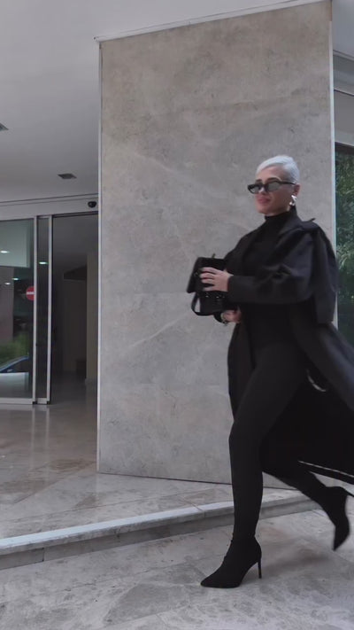 Oversize kalıbı ve omuzlarında bulunan pelerin detayları ile güçlü bir tasarım. biye detaylı kemer dahil mevsimlik trench