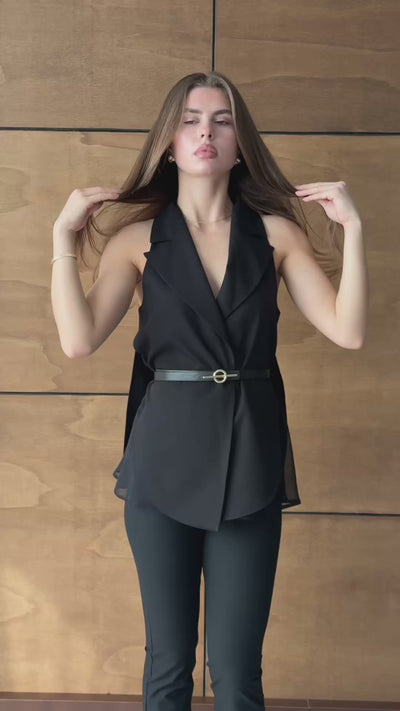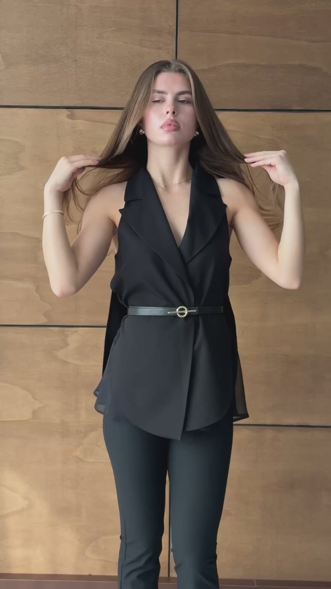 Şifon detaylarla hareket kazandırılan, viskon içerikli kumaştan tasarlanmış yelek. Kemer dahildir.